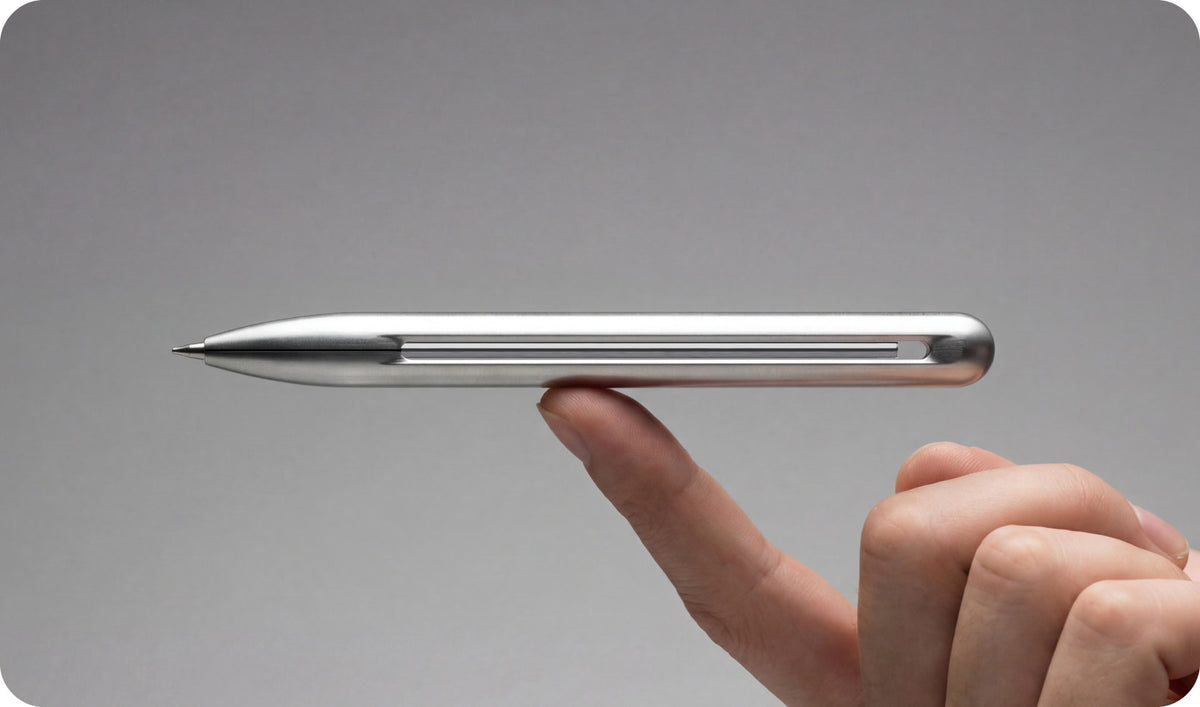 A simple press opens the body, the refill is adjusted, and once released, physics locks it securely in place — without springs, clicks, or moving parts.